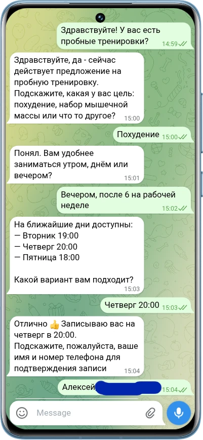 Фитнес-центр активно привлекает лиды через рекламу в Telegram, но менеджеры не успевали оперативно отвечать на сообщения. Часть потенциальных клиентов терялась, запись на тренировки велась вручную, а аналитика по лидам и причинам отказов отсутствовала.
