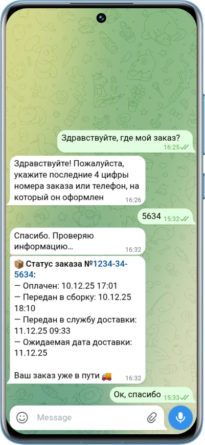 «Где мой заказ?», «Когда доставят?», «Почему статус не меняется?». Операторы тратили до половины рабочего времени на ответы, не связанные с продажами.