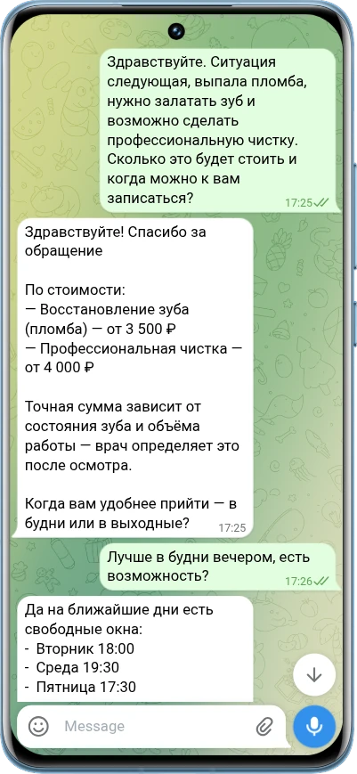 В клинике используется AI-бот, который общается с потенциальными пациентами в мессенджерах 24/7. Бот консультирует по услугам, стоимости и врачам, помогает выбрать удобное время и записывает пациентов на приём без участия администратора.