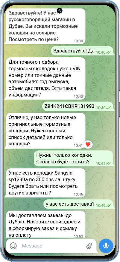 В магазине используется AI-бот, который берёт на себя первичное общение с клиентами. Бот уточняет параметры автомобиля, подбирает нужные запчасти, консультирует по наличию и цене и подводит клиента к оформлению заказа прямо в чате.